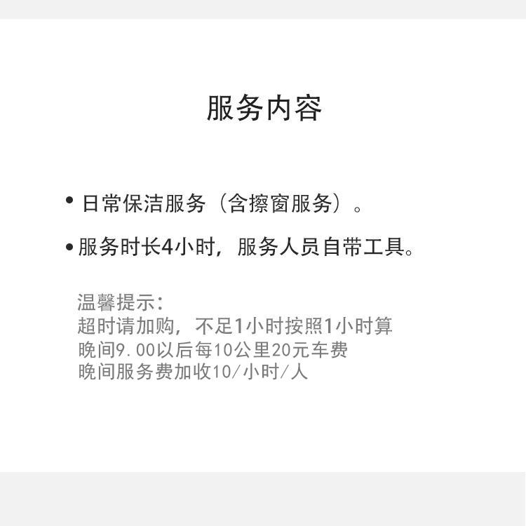 服务时长:4小时/人/次; 阿姨经过160个小时严格培训,持四证上岗。上门携带专业工具,多色干湿毛巾,区分避免交叉污染,使用进口环保清洁剂。 晚间9.00以后每10公里20元车费 晚间服务费加收10/小时/人 服务区域及服务标准: 1. 卧室:床面平铺、台面物品摆放整齐、家具电器擦拭、门窗清理、墙面地面除尘、更换垃圾袋; 2. 客厅/餐厅:台面物品摆放整齐、台面擦拭、家具电器表面擦拭、室内门窗除尘清洁、墙面地面除尘清洁、更换垃圾袋; 3. 卫生间:台面物品摆放整齐、马桶清洁、家电表面擦拭、镜子清洁、五金件清洁、墙面地面清无人水池浴缸淋浴房清洁、更换垃圾袋; 4. 厨房:台面物品摆放整齐、抽油烟机表面除尘、灶台清洁、厨电表面擦拭、五金件清洁、墙面地面清洁、水池清洁、更换垃圾袋; 5. 书房/储物间:桌面物品摆放整齐、桌面擦拭、墙面地面清洁、更换垃圾袋; 6. 阳台:阳台扶手、开关插座、墙面地面清洁。 服务保障: 1.本公司郑重承诺:所有服务人员均经过严格的身份认证及登记备案,持4证上岗(身份证、健康证、上岗证、毕业证); 2.所有人员均上有人员以外险家政险,出现任何人身意外物品损坏都会得到保障,无后顾之忧; 保证服务质量,如服务人员服务得不到位或有怠工请您及时联系我们,我们坚决严肃处理并安排其他服务人员进行返工,直到服务满意为止。