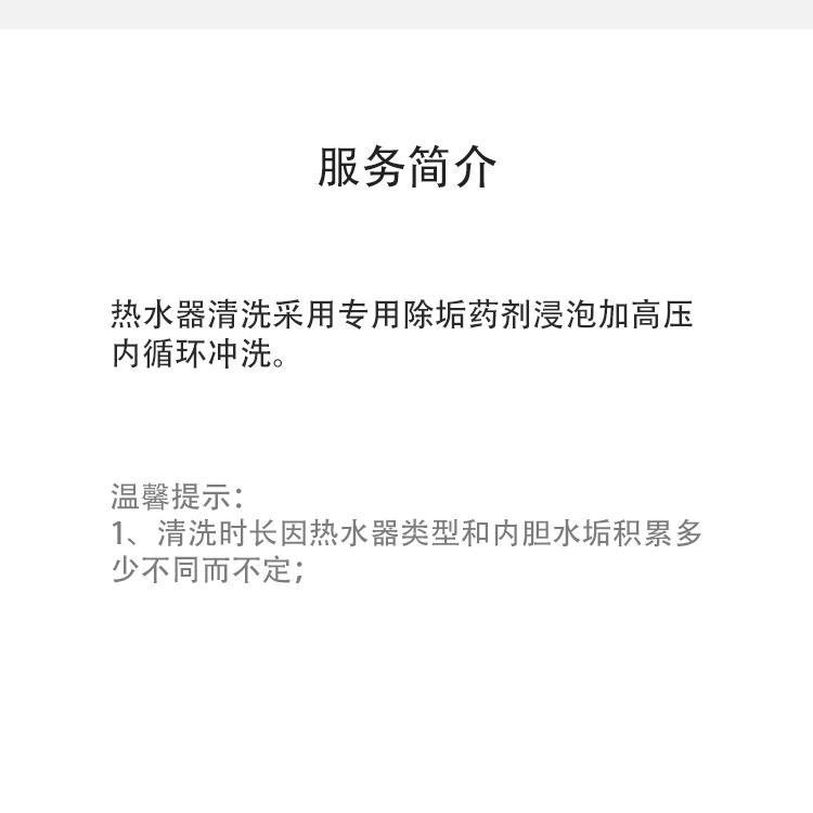服务内容: 专用除垢药剂浸泡+高压内循环冲洗; 服务标准: 热水器内胆无水垢,单台服务时长不定; 服务保障: 1.本公司郑重承诺:所有服务人员均经过严格的身份认证及登记备案,持4证上岗(身份证、健康证、上岗证、毕业证); 2.所有人员均上有人员以外险家政险,出现任何人身意外物品损坏都会得到保障,无后顾之忧; 保证服务质量,如服务人员服务得不到位或有怠工请您及时联系我们,我们坚决严肃处理并安排其他服务人员进行返工,直到服务满意为止。