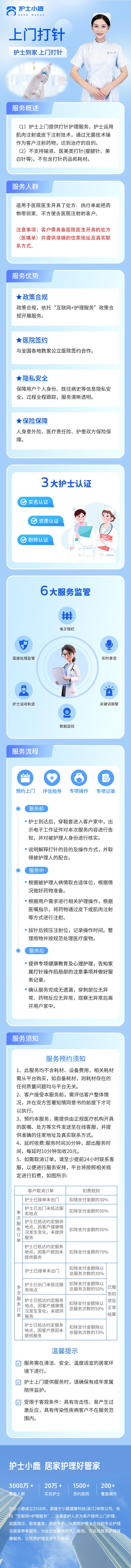 订购须知1.商家将在您下单后30分钟内确认接单。 2.订单确认后,修改订单或退款需提前3小时通知。 3.预约成功后由于您个人原因退单,将收取30%服务费。 4.护士出发后由于您个人原因退单,将收取70%服务费。 5.如商家接单后爽约将全额退款并向您赔付30元。 6.为保障您的权益,所有费用请通过到位平台支付。 7.延时费:每次服务时长不超过30分钟,如超出服务时长,每超时20分钟将加收20%(40元)延时服务费。 8.耗材费:上门可携带服务所需耗材,耗材费用需用户支付。 9.不在服务范围内:受限于客观条件,具有攻击性、易产生过激反应的患者,不在服务范围以内。 10.本服务由专业医疗机构「护士小鹿」提供,专家团队全程支持。